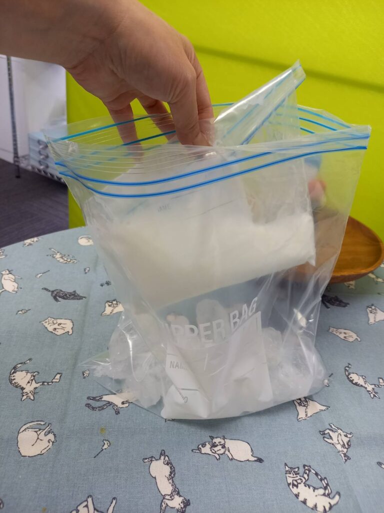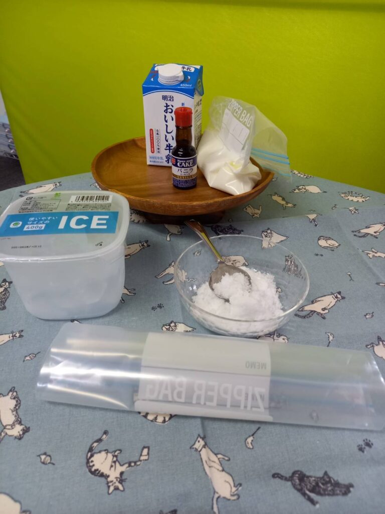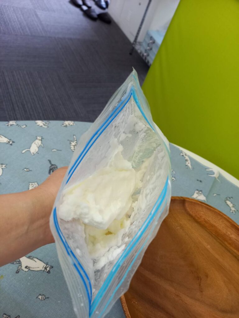 *ジッパー付きの保存袋に上記3つを入れて、よーく混ぜます!別のジッパー付きの保存袋(材料をいれた保存袋よりも少し大きめのものだとGoot!)に氷と塩を入れます。氷と塩が入った保存袋の中に、材料をいれた保存袋をそのまま(袋ごと)入れて、5分ほどシャカシャカ振ります。