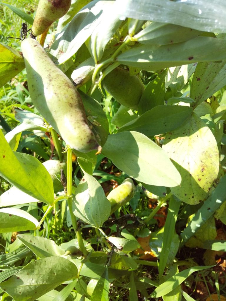 やがて夏になり暑くなると、雑草の茂みのなかにソラマメが。